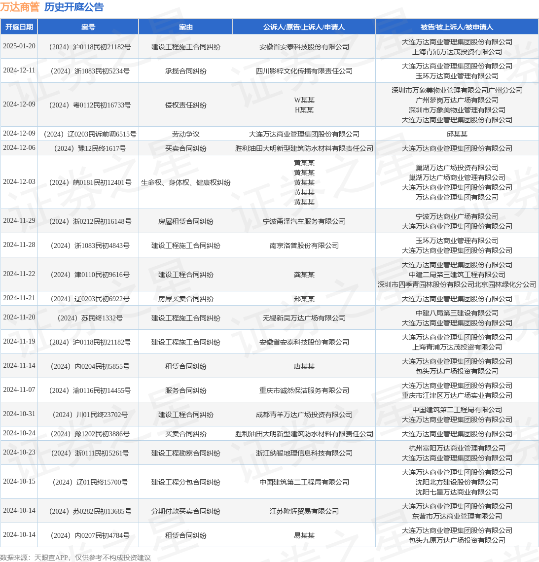 案号:(2024)浙1083民初5234号审理法院:玉环市人民法院案由:承揽合同纠纷当事人信息: 原告/上诉人:四川影粹文化传播有限责任公司 被告/被上诉人:大连万达商业管理集团股份有限公司、玉环万达商业管理有限公司开庭日期:2024年12月11日根据统计,近一年内以大连万达商业管理集团股份有限公司为当事人的历史开庭公告有107则,其中案由为“建设工程施工合同纠纷”的公告以21则居首,其次为“建设工程合同纠纷”有11则,“建设工程分包合同纠纷”有10则。历史开庭公告(前20条)如下: